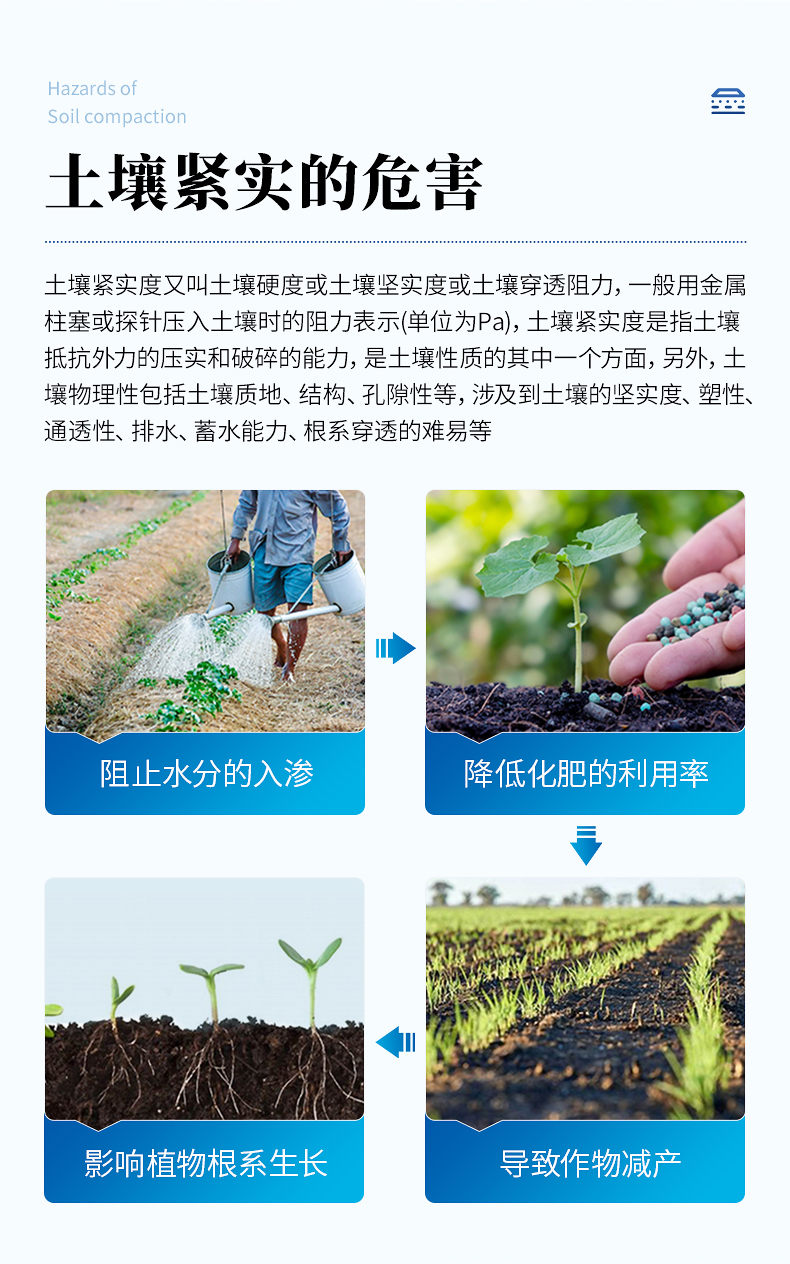 土壤緊實(shí)度又叫土壤硬度或土壤堅(jiān)實(shí)度或土壤穿透阻力。一般用金屬柱塞或探針壓入土壤時(shí)的阻力表示(單位為Pa)。土壤緊實(shí)度是指土壤抵抗外力的壓實(shí)和破碎的能力,是土壤性質(zhì)的其中一個(gè)方面。另外,土壤物理性包括土壤質(zhì)地、結(jié)構(gòu)、孔隙性等,涉及到土壤的堅(jiān)實(shí)度、塑性、通透性、排水、蓄水能力、根系穿透的難易等。
