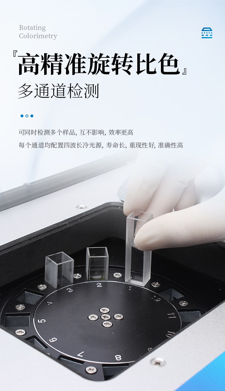 2、采用精密旋轉比色池設計(專利號:ZL 2018 2 1777724.7),光源一致性更加精確,保證檢測精度。