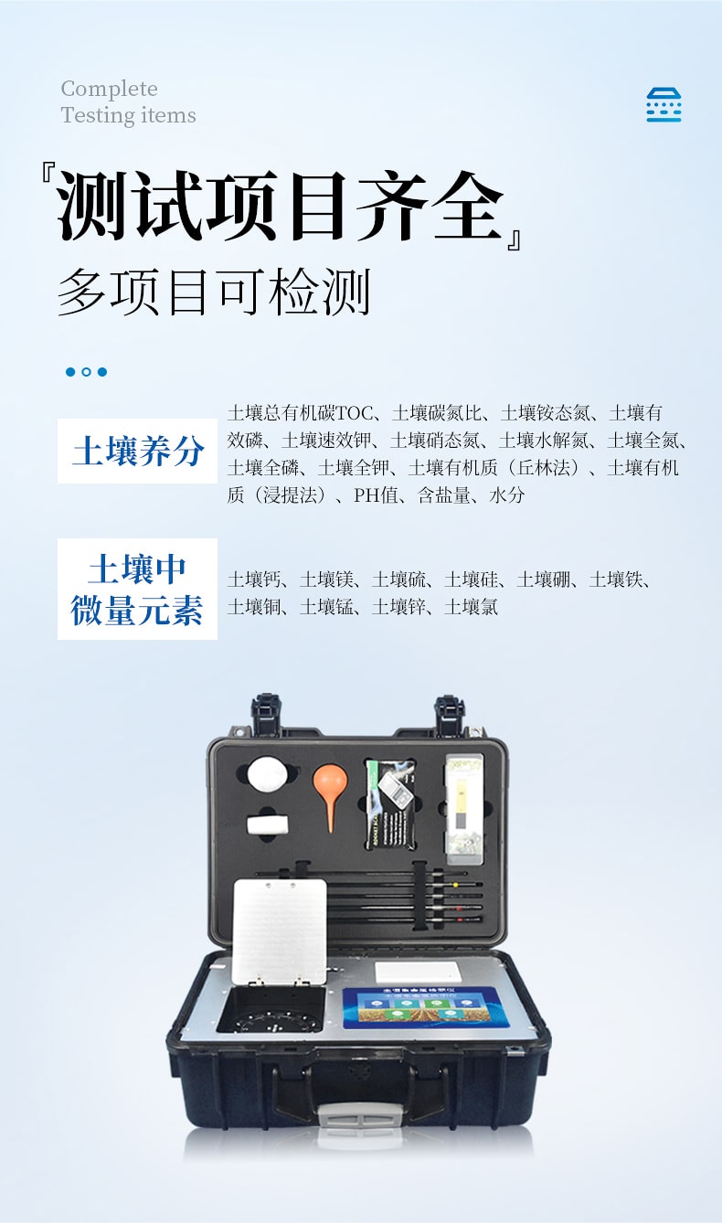 1、土壤養分:●土壤總有機碳TOC、土壤碳氮比、土壤銨態氮、土壤有效磷、土壤速效鉀、土壤硝態氮、土壤水解氮、土壤全氮、土壤全磷、土壤全鉀、土壤有機質(丘林法)、土壤有機質(浸提法)、PH值、含鹽量、水分?!裢寥乐形⒘吭兀和寥棱}、土壤鎂、土壤硫、土壤硅、土壤硼、土壤鐵、土壤銅、土壤錳、土壤鋅、土壤氯。