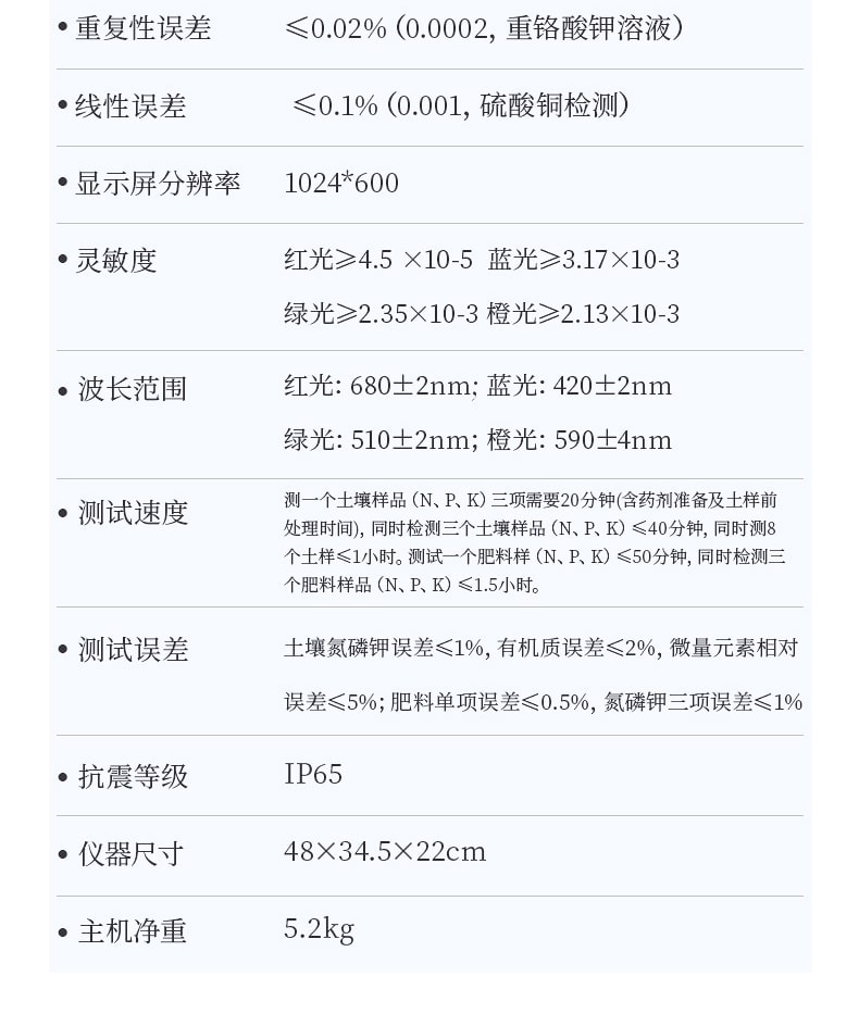 土壤氮磷鉀誤差≤1%,有機質誤差≤2%,微量元素相對誤差≤5%;肥料單項誤差≤0.5%,氮磷鉀三項誤差≤1%。