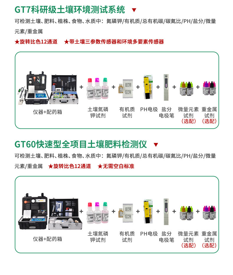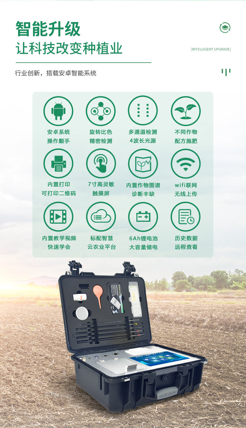 配套齊全:該儀器集藥、器、儀為一體,攜帶方便,相當于一個小型移動實驗室,無需用戶自配附件,亦可靈活野外流動測試。適于農業服務部門或農資經銷商、高教院校、科研院所、合作社、肥料廠商、大種植戶測土施肥和鑒別肥料真假及環保檢測應用。
